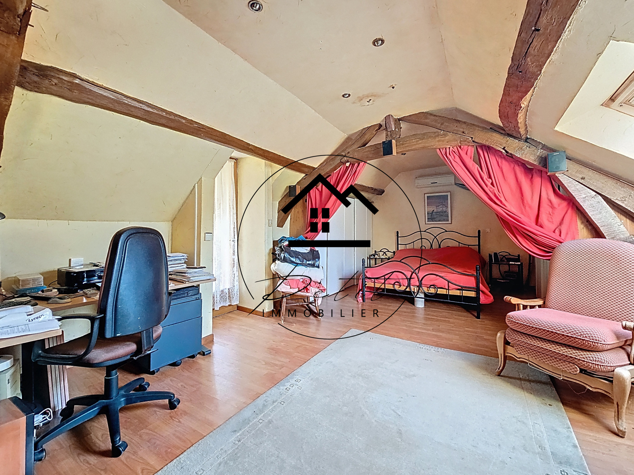 À l’étage, le palier dessert deux chambres, un bureau avec WC, ainsi qu’une suite parentale située dans l’aile opposée, disposant de sa propre salle de bain, offrant ainsi un espace nuit confortable et indépendant.