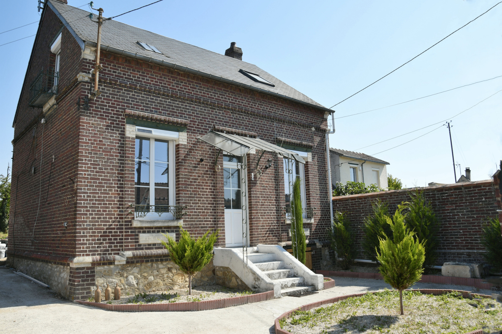 Maison en brique entièrement rénovée offrant au rez-de-chaussée un séjour double, une cuisine ouverte, une chambre parentale avec une salle de bains et wc. A l 'étage un palier permettant accès à trois chambres, une salle d'eau et wc. Une cave, chauffage électrique, double vitrage PVC et stores solaires. L'ensemble sur 593 m2 de terrain clos. (Achèvement de travaux en cours, maison vendue intérieurement clef en main. Taxe foncière approximative.)